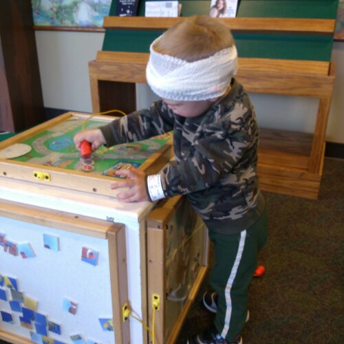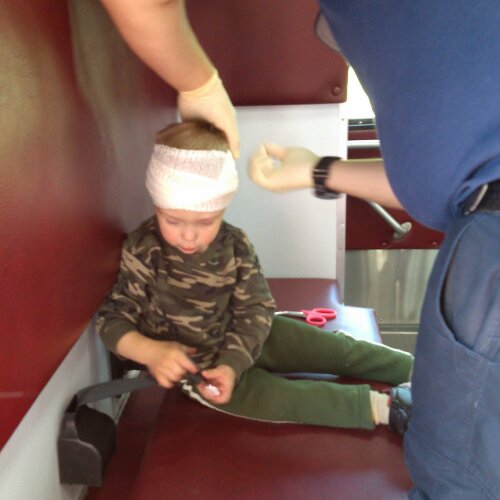 He was more interested in TV and toys than his head. He was running around the waiting area like his normal self. He eventually took off his bandage and started throwing it.