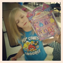 Lily received a sticker set, then she realized that there was a candy cane in the bag. She loves candy canes, especially this time of year.