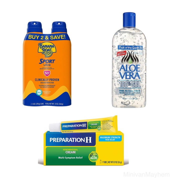 Sunscreen and sunburn relief. Those rays can burn when they’re beating down on the field. Sunscreen will help prevent painful sunburns. Aloe is good for soothing sunburns, but so is hemorrhoid cream. Crazy, but it works!